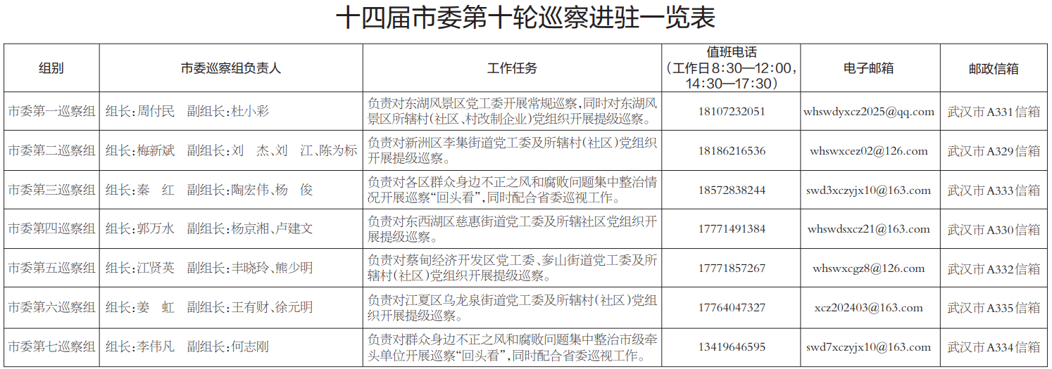 據悉,本輪巡察工作時間60天左右,期間設立專門值班電話、郵政信箱、電子郵箱和“荊楚碼上巡”信訪反映二維碼,主要受理反映被巡察黨組織領導班子及其成員、下一級黨組織主要負責人和重要崗位人員問題的來信來電和舉報反映。(記者 胡雪璇 通訊員 陳仕奇)